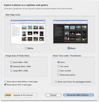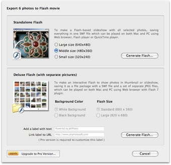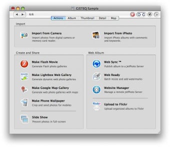 Una vez hayas importado las fotos desde tu cámara digital o desde iPhoto, incluso puedes crear un álbum desde el Finder a partir de una carpeta de imágenes, un amplio abanico de acciones están a tu alcance, como por ejemplo la creación de un vídeo Flash, un pase de fotos, una galería de fotos usando Google Map,etc. Hasta puedes exportar una foto a tu móvil, gracias a plantillas según la resolución y el modelo, como fondo de pantalla.